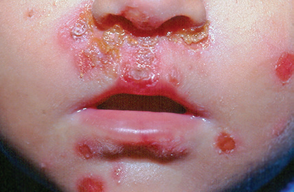 LA FORMA PRIMARIA SE LOCALIZA A MENUDO ALREDEDOR DE LOS ORIFICIOS NATURALES (COSTROSA O ESTREPTOCÓCICA): BOCA, FOSAS NASALES, PABELLONES AURICULARES Y OJOS, COMO CONSECUENCIA DE UNA INFECCIÓN EN ESTOS SITIOS QUE GENERA LAS LESIONES CUTÁNEAS (FIGS. 72-1 Y 72-2); EN LACTANTES PREDOMINA EN EL PERINÉ, EN LA REGIÓN PERIUMBILICAL O ES DISEMINADO (AMPOLLAR O ESTAFILOCÓCICO).