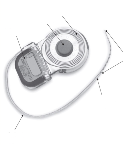 The external transmitting coil sits outside on the skin and sends the digital signal information and power by radio frequency through the skin to the implant inside and its internal receiver
