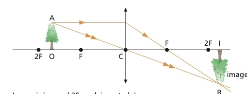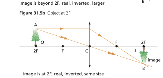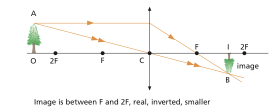 What is the image produced by a conveging lens like when the object is more than two focal lengths from the centre of the lens? and Draw it