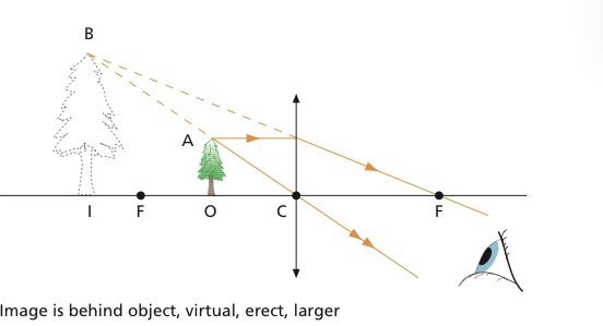 What is the image produced by a conveging lens like when the object is between the principal focus and the centre of the lens?