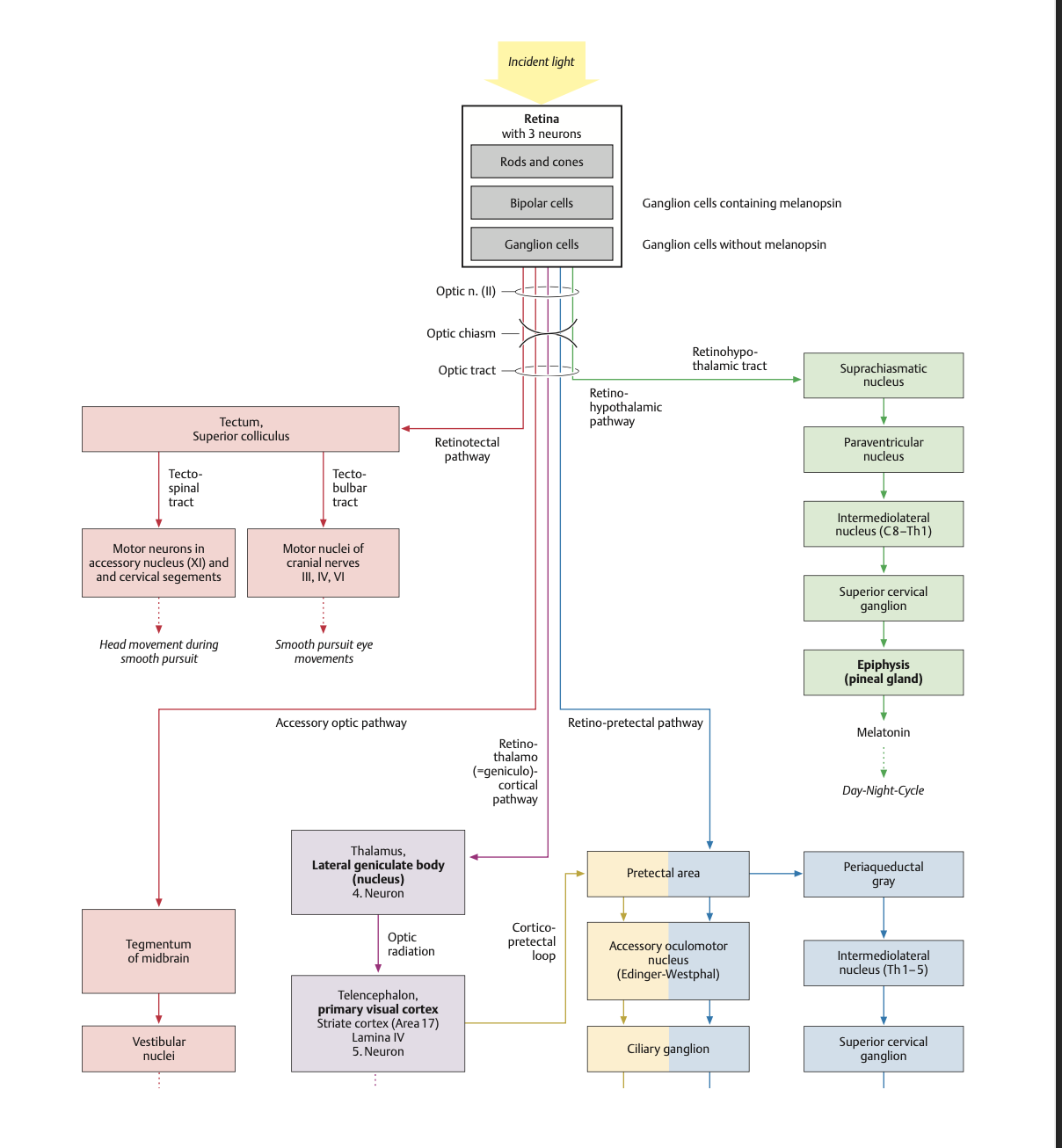 Influences the circadian rhytm (e.g., day/night cycle) by measuring the daily light levels. Information relayed to the hypothalamus passes through several relay stations to reach the epiphysis (melatonin production and release).