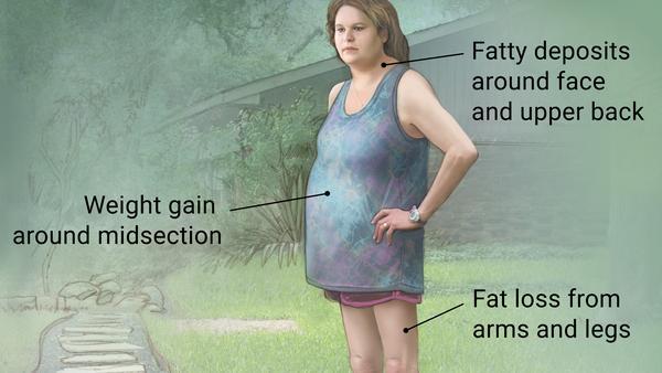 Sx- Fatty hump between the shoulders, rounded face, heavy midsection, skinny limbs.