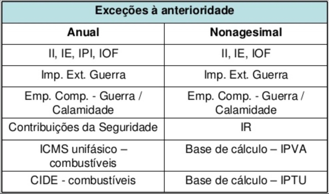 📢 Quanto à exceção ao princípio da anterioridade, deve ser observado que não é o IPTU que é exceção ao princípio da noventena, mas apenas a fixação de sua base de cálculo (a alíquota do IPTU permanece sujeita à noventena).