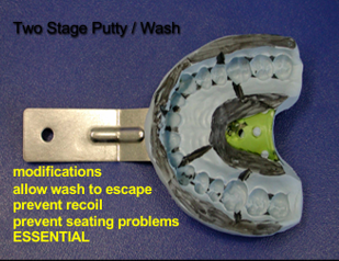 Instead of modifying the tray, we use a plastic bag or other form of space over the putty to take the impression. Then this acts as a ‘custom tray’ place light body throughout the tray and place over prep.
