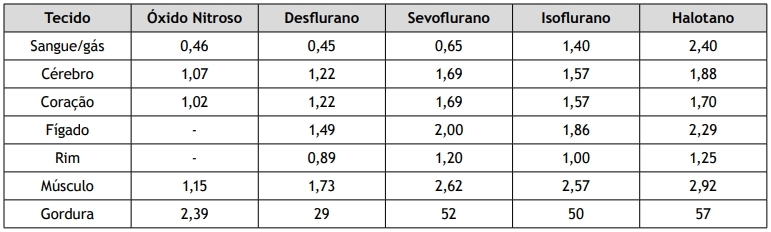 Tabela dos coeficientes de partição nos diferentes tecidos