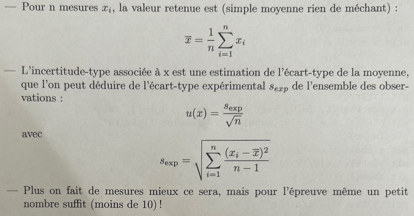 Exprimer la moyenne /x, l’écart-type s_exp et l’incertitude-type u(x), associés à n mesures d’une grandeur x (incertitude de type A).