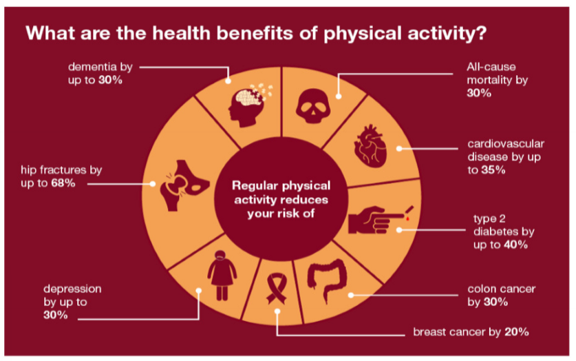 Increased activity leads to decreased coronary heart disease, decrease risk of cancers, decrease risk of type 2 diabetes and dementia and decrease risk of back and joint pain