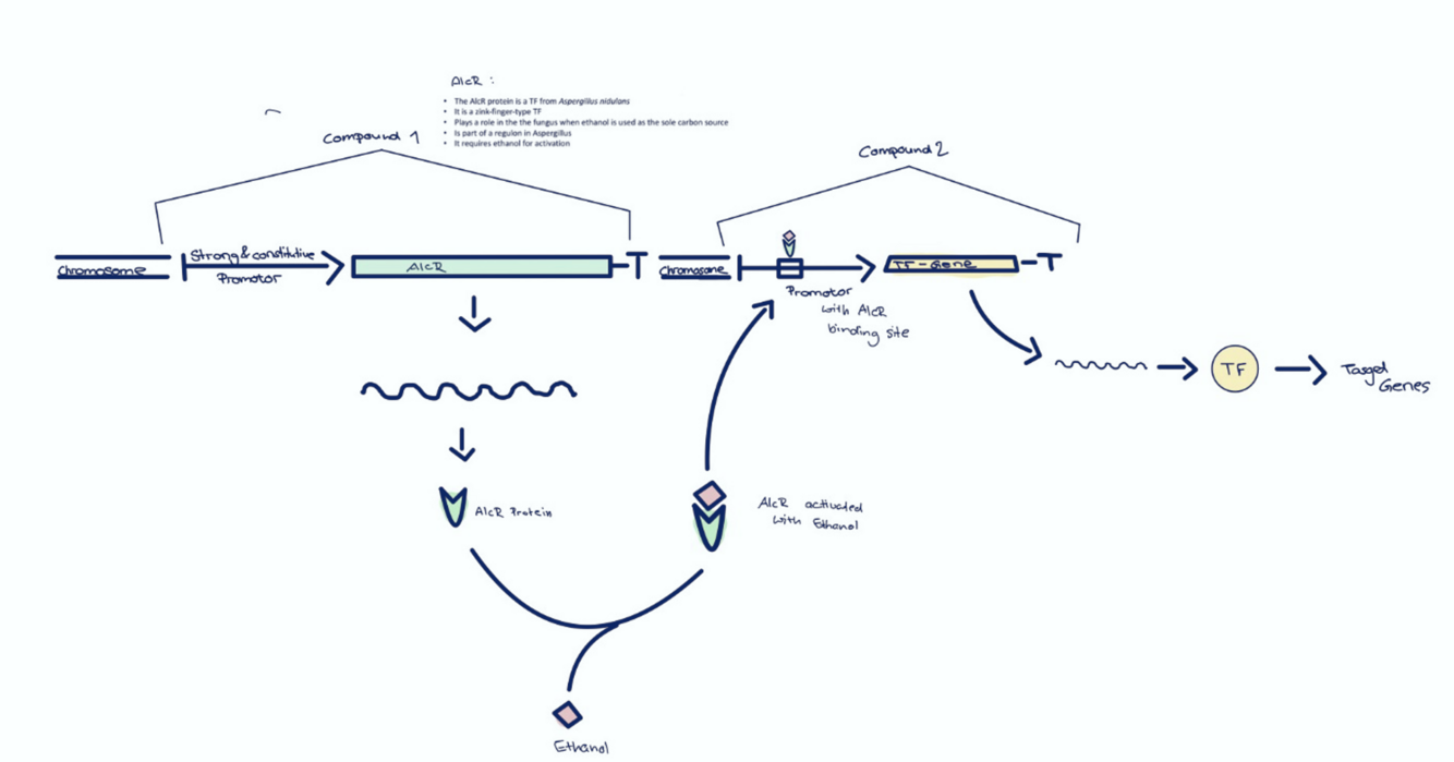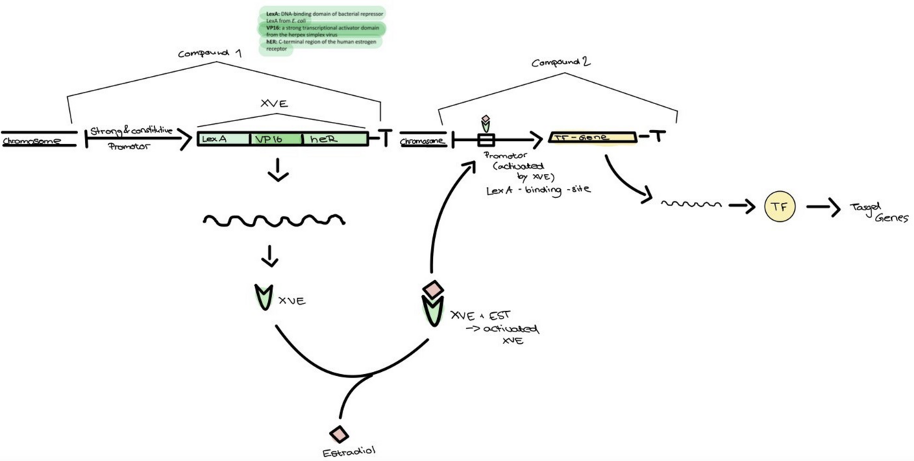 The activated form of XVE is then able to bind to the promotor region of the Gene of Interest (e.g.: another TF) whose expression is then induced.