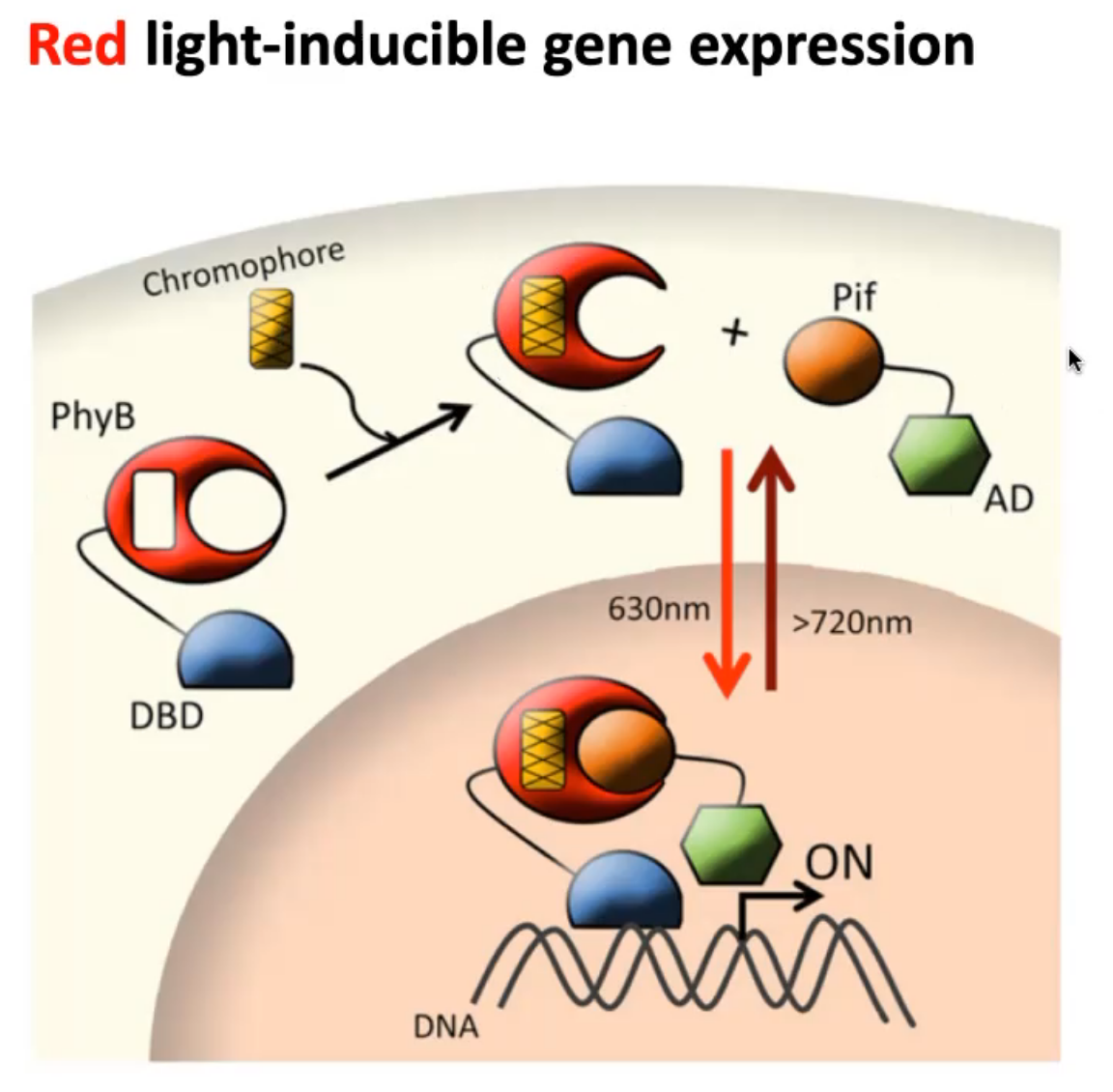 * Red light: 660 nm: PhyB and PIF form PhyB-PIF complex (active) that can bind promotor of target genes.