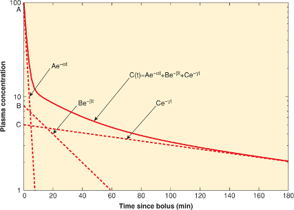 -Rapid distribution phase(A): plasma –> peripheral tissues