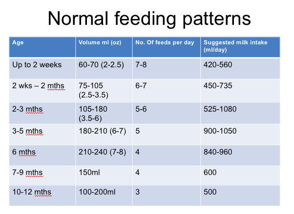 Normal feeding patterns - how does the number of feeds per day change with age?
