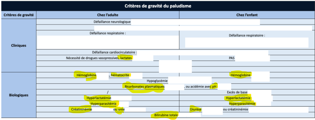 Critères gravité paludisme : en ped et chez l’adulte, compléter le tableau suivant, les cases en jaune