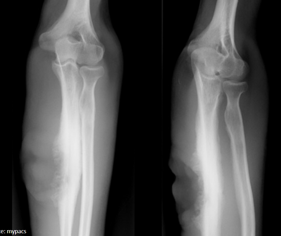3-year-old male presents with leg pain and swelling. He is radiographed several days into his symptoms.