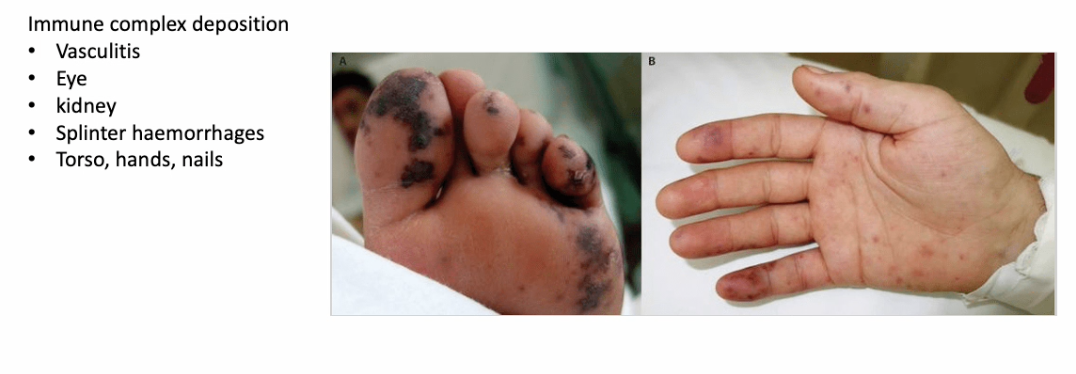 - systemic problems - vasculitis - eye, kidney (splinter haemorrhages and on torso, hands and nails)