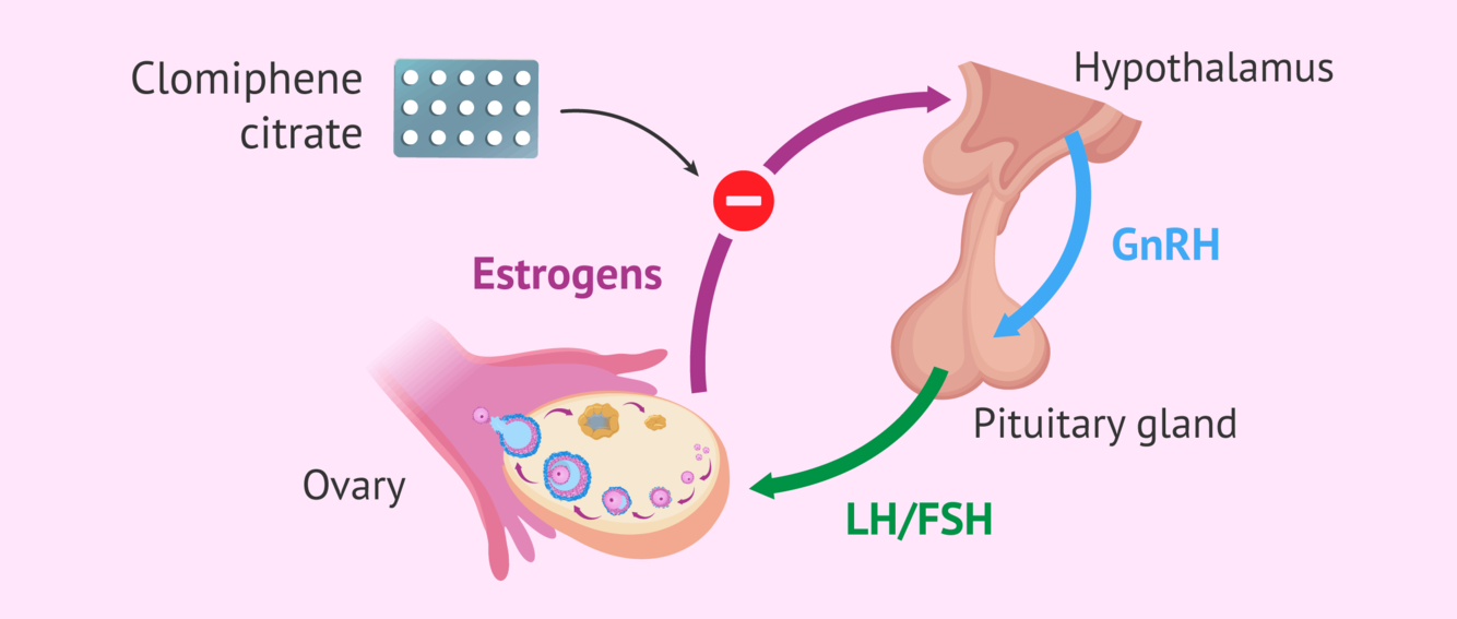 given on days 2 to 6 of the menstrual cycle to stop negative feedback of oestrogen on the hypothalamus resulting in greater release of GnRH and subsequently FSH and LH