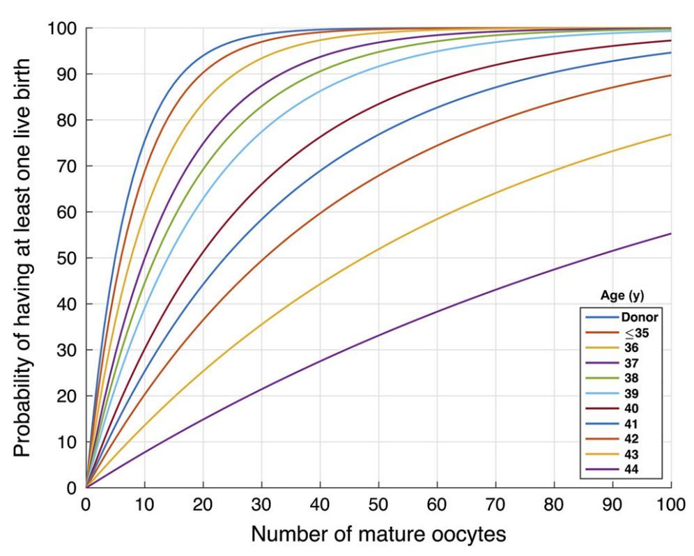 Graph showing probability of at least one live birth by age and # of oocytes frozen