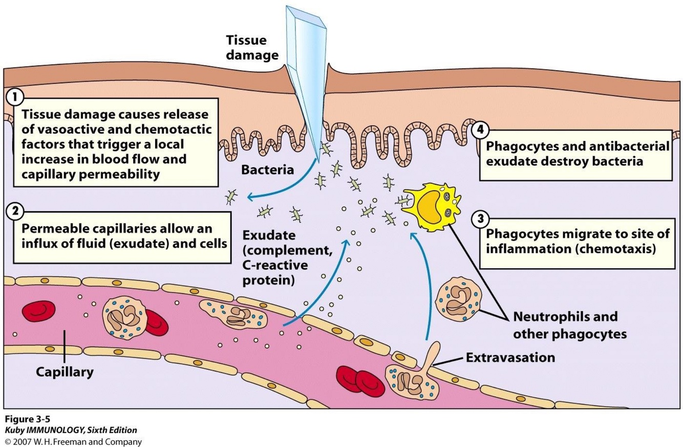 -few hrs = leukocytes to endothelium -> extravasation (passing of cells from blood into tissue)