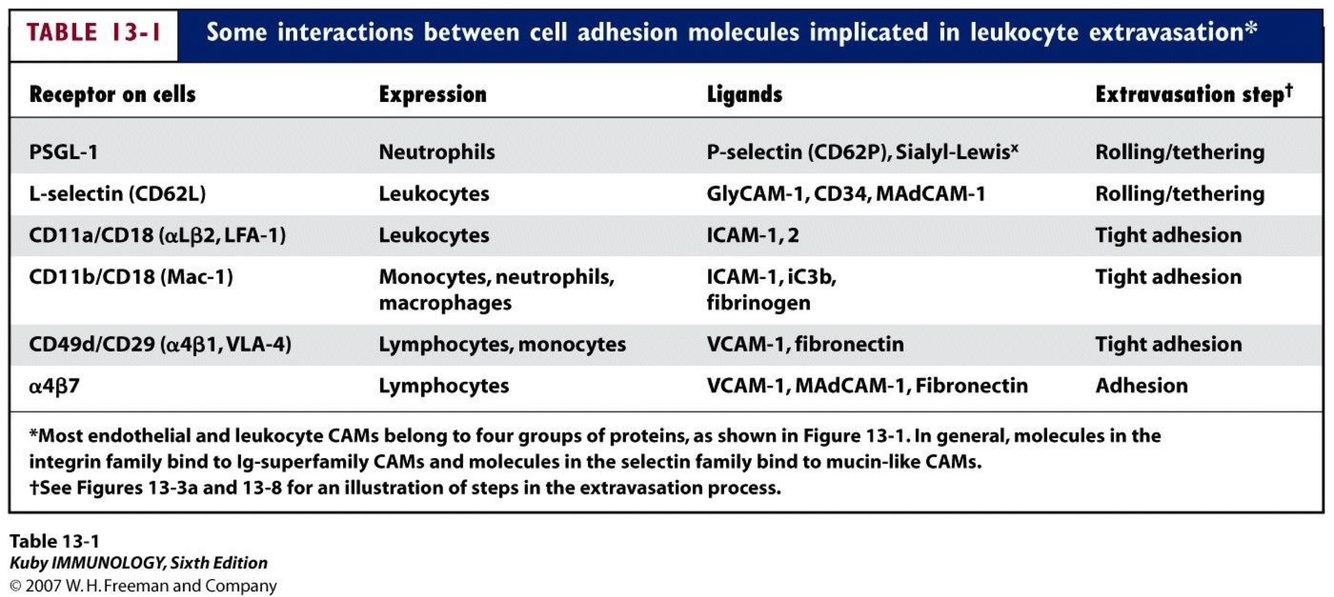3. Adhesion = integrins on leukocytes bind to endothelium