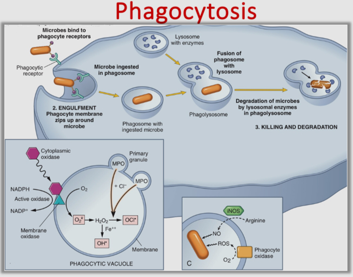 (E) Fusion of the lysosomes (primary granules) with the phagosome allows the discharge of lysosomal enzymes into the phagolysosome and triggers the respiratory burst, which results in bacterial killing.