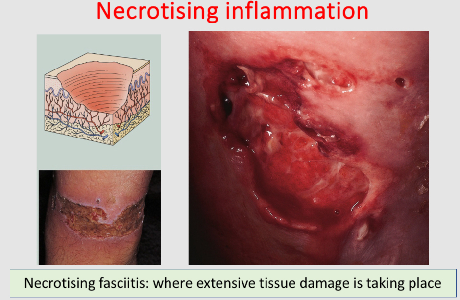 when a virulent organism produces severe tissue damage and extensive cell death. Examples include necrotizing fasciitis and necrotizing pharyngitis