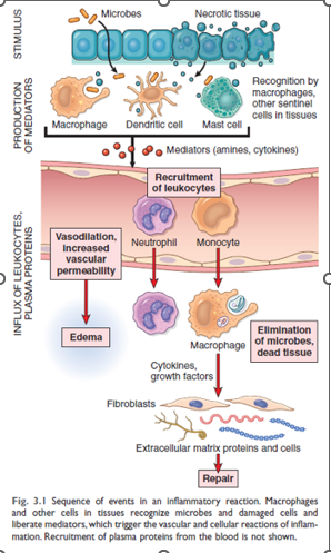 réponse des tissus vascularisés aux infections et aux dommages tissulaires permettant le reccrutement des cellule et molecules de defense de l’hote, de la circulation jusqu’aux sites necessaire afin d’éliminer la cause initiale des blessures cellulaires, les conséquences de celles-ci et amorcer le processus de réparation