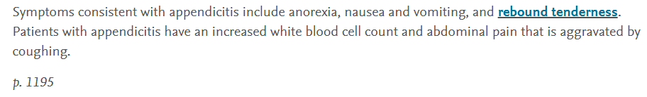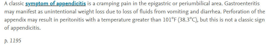 o Initially in the abdomen or flank area (around umbilicus), then progresses to MCBURNEYS POINT (RLQ between the anterior iliac crest and the umbilicus