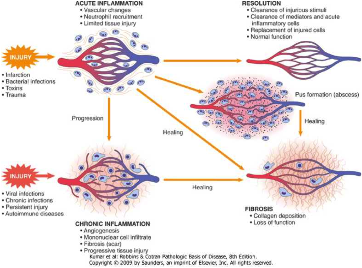* NB: necrosis and fluid accumulation (exudate) tend to more be associated with ACUTE inflammation; while fibrosis and accumulation is more CHRONIC.*