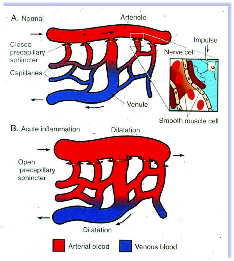 * NB: the arterioles and venules both become dilated as a result the capillary channels are also dilated and as a result the blood 7low through the area slows leading to the exudative phase*