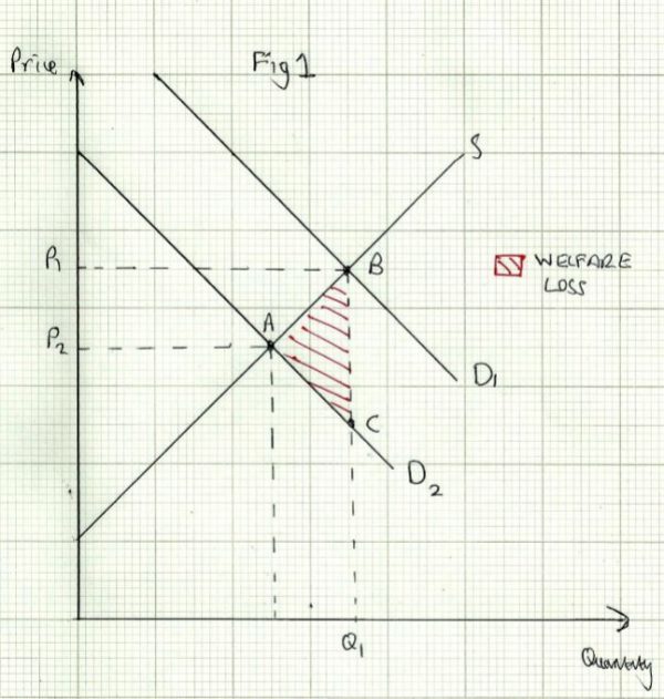 Just a rightwards shift in demand. This is because consumers may overestimate the utility they will derive from the good. This good may be overproduced rather than a cheaper, more effective good. D1 shows the demand due to imperfect information, D2 is where demand would be if consumers had perfect information, ABC is the information gap