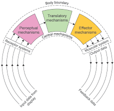 gathers perceptual info (flight of ball, sound of man on call, how limbs and muscles feel during in)