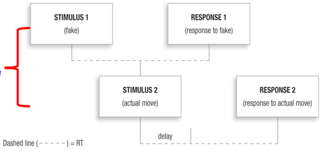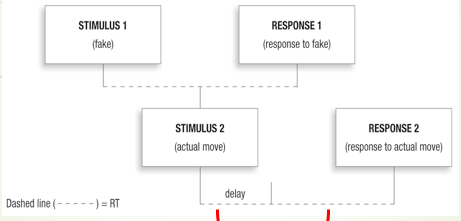 delay in responding to the 2nd of two closely spaced stimuli (still reacting to fake 1st)