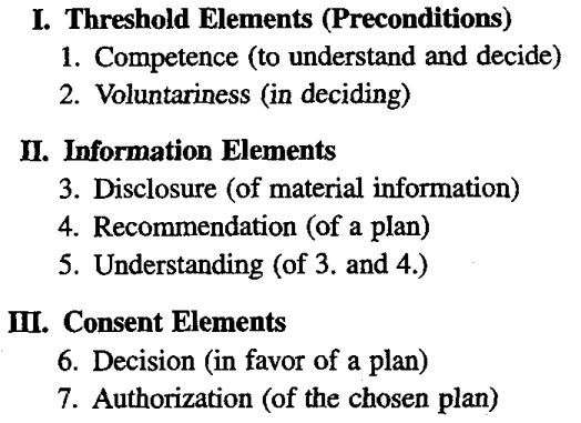 competence, voluntariness, disclosure, recommendation, understanding, decision, and authorization