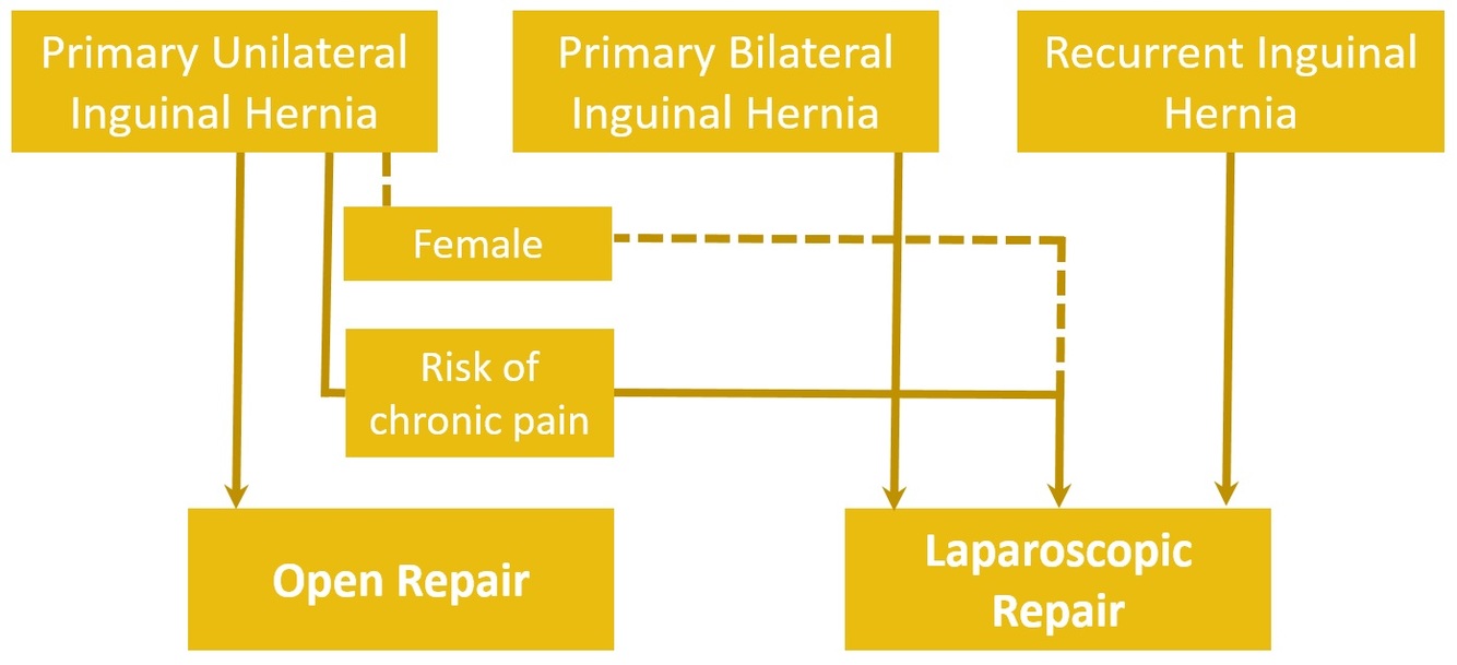 A laparoscopic approach is preferred in those with bilateral or recurrent inguinal hernias. It can also be considered in certain patients with a primary unilateral hernia, mainly those at a high risk of chronic pain (young and active, previous chronic pain, or with a predominant symptom of pain) or in females (due to the increased risk of the presence of a femoral hernia).