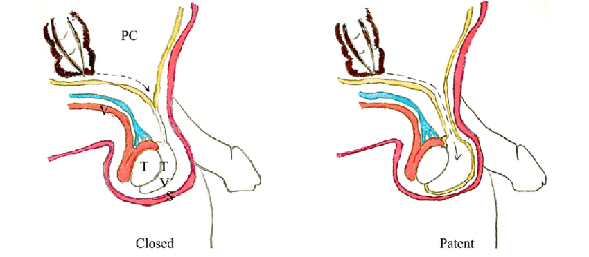 How does an INDIRECT inguinal hernia arise? (2 steps)
