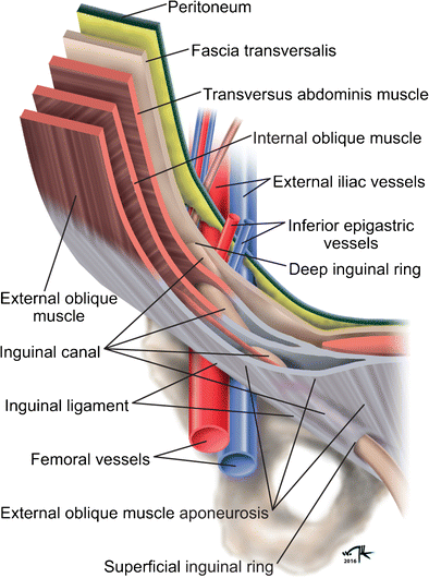 2) Obliteration of the femoral canal defect in the femoral canal, by approximation of the iliopubic tract to the Cooper ligament versus placement of a prosthetic mesh.