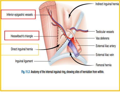 Indirect inguinal hernias occur lateral to Hesselbach’s triangle.