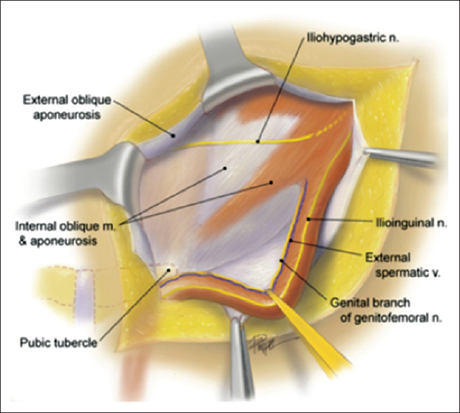 A patient previoiusly diagnosed to have a right indirect inguinal hernia noticed that the mass has become non-reducible for a day. On PE, he has a T of 38.9 C, the mass is noted to be tender and warm. He has direct and rebound tenderness at the right lower quadrant of the abdomen. What would be your surgical approach?