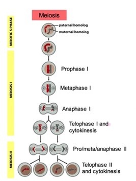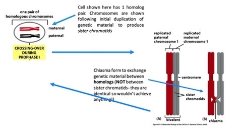 3- At prophase I the duplicated homologous pairs line up and regions of the chromosomes cross over to exchange genetic material (chiasma). Crossing over occurs between the homolog pairs, not the sister chromatids, as these are genetically identical.