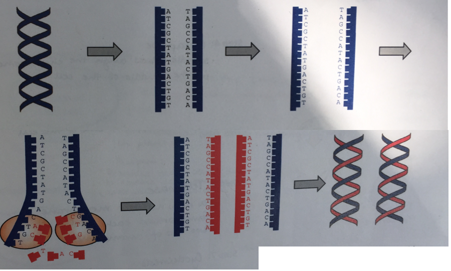 step 2: new DNA strands are made by connecting free nucleotides together using the old strand as a template