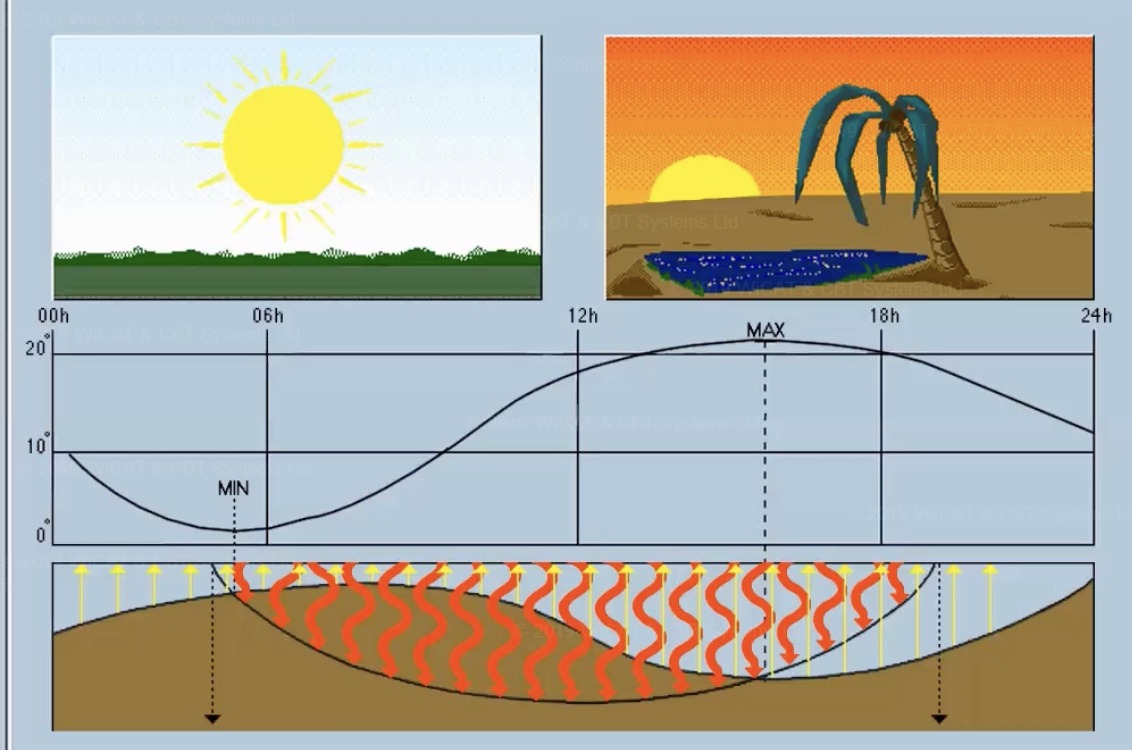 This means heat coming in from the sun during the day is largely kept at night ( shortware from sun, long wave from earth ).