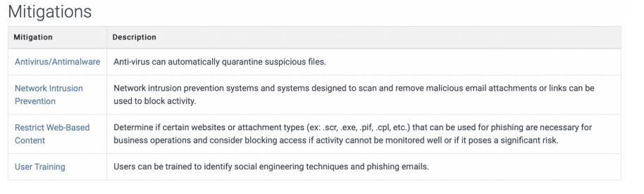 MITRE offers some great mitigations that we can use to reduce the risk from phishing emails, shown below (all of which we covered in the Phishing Analysis domain!)