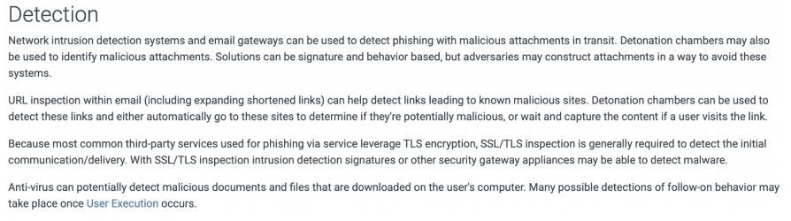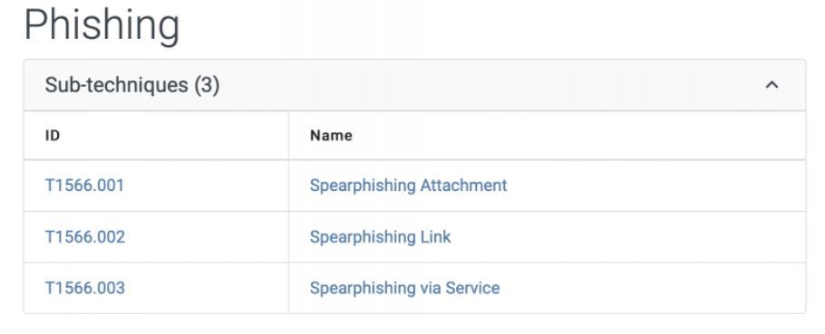 By now you should already understand how important phishing is, and that it’s the number one initial access method. We can see that this technique actually has three sub-techniques, which are shown below (well done MITRE!). These pages will include a description of the technique, mitigations, and how to improve detection.
