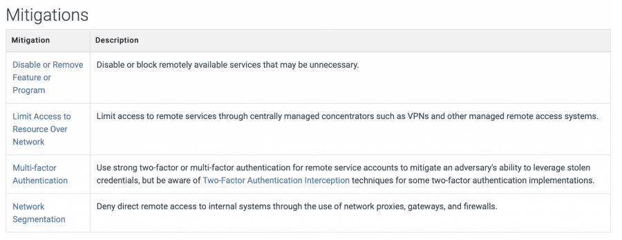 MITRE offers some Mitigations that we can use to reduce the risk from internet-facing remote services. Examples include disabling the service if it is not needed (this is very important!), and using two-factor authentication to prevent credential reuse attacks (where an attacker finds old credentials and tries them against other services in the hope that the user has used the same password in different places).