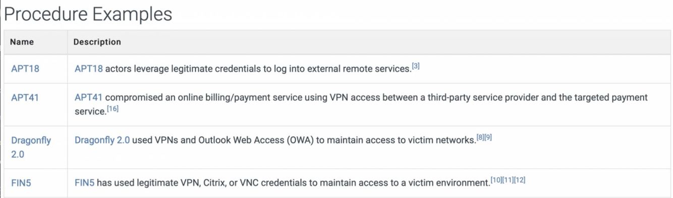 For an adversary to use this tactic, it is highly likely that they will also use the Initial Access technique T1078 Valid Accounts, so they can log into these remote services (harvesting accounts from data breaches, phishing with credential harvesters, social engineering, and so on). An alternative is brute-forcing credentials to try and find a valid account, but this is extremely noisy and can easily be detected, and is therefore not typically used by advanced actors. Having access to valid accounts and remote services can also make for a good persistence mechanism, allowing the attacker to connect back to systems within the private network.
