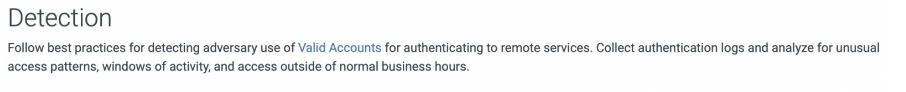 And below that we have the Detection section which is short and sweet, and recommends monitoring usage of remote services and alerting on anomalous activity, such as an employee who works 9am – 5pm but is logging in to Remote Desktop Protocol at 3am.