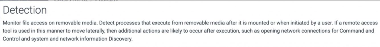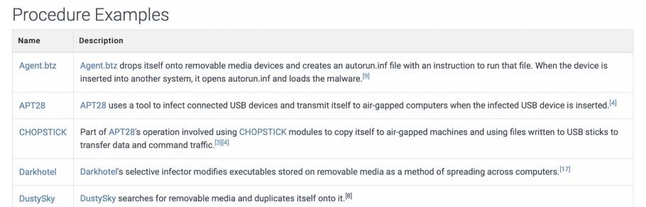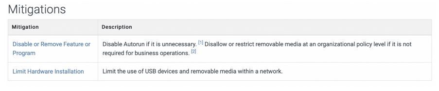 Below this we have the table for Mitigations to help protect the organization from this attack technique, and we have some pretty solid options, such as disabling AutoRun so that USB Devices won’t automatically run any files included on them, creating policies that state employees should simply not use USBs, and actually locking the system down so that it won’t register USBs at all (we can also use USB port blockers which sit in the USB port and can’t be removed without a special key).