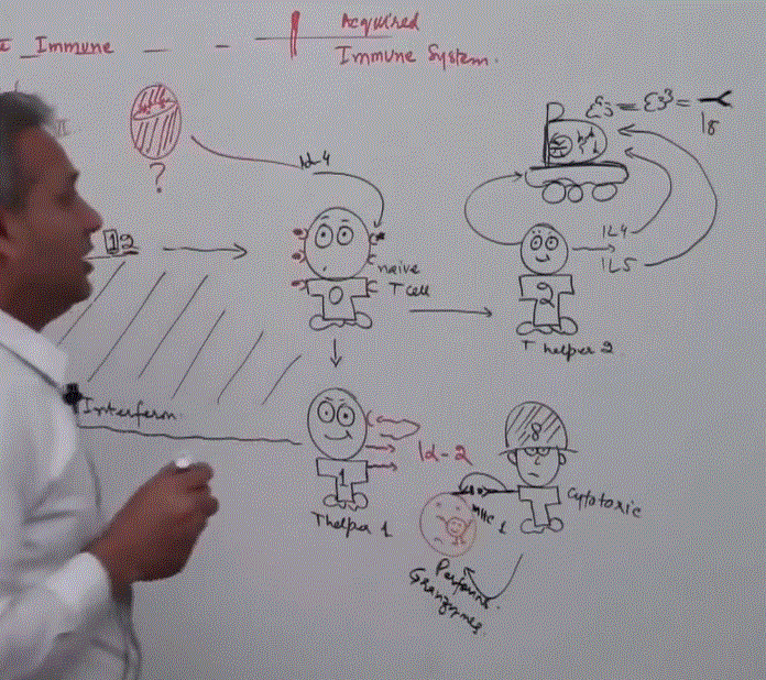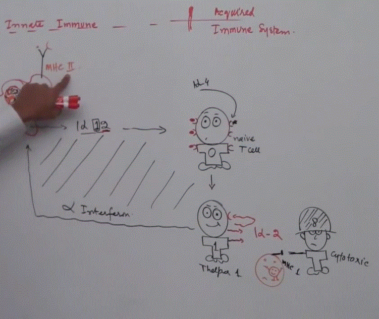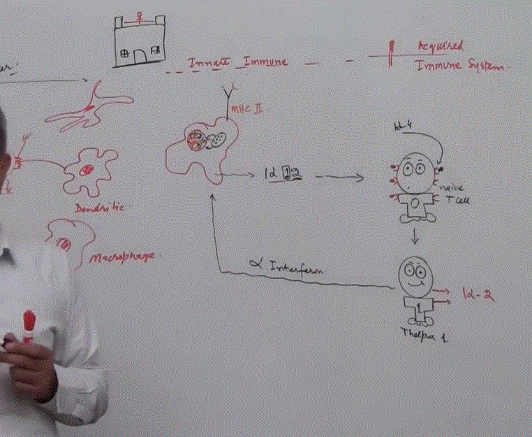 Macrophage secretes IL-12 which turns T0 cells into Th1 cells. They then secrete gamma interferon which stimulates the macrophage