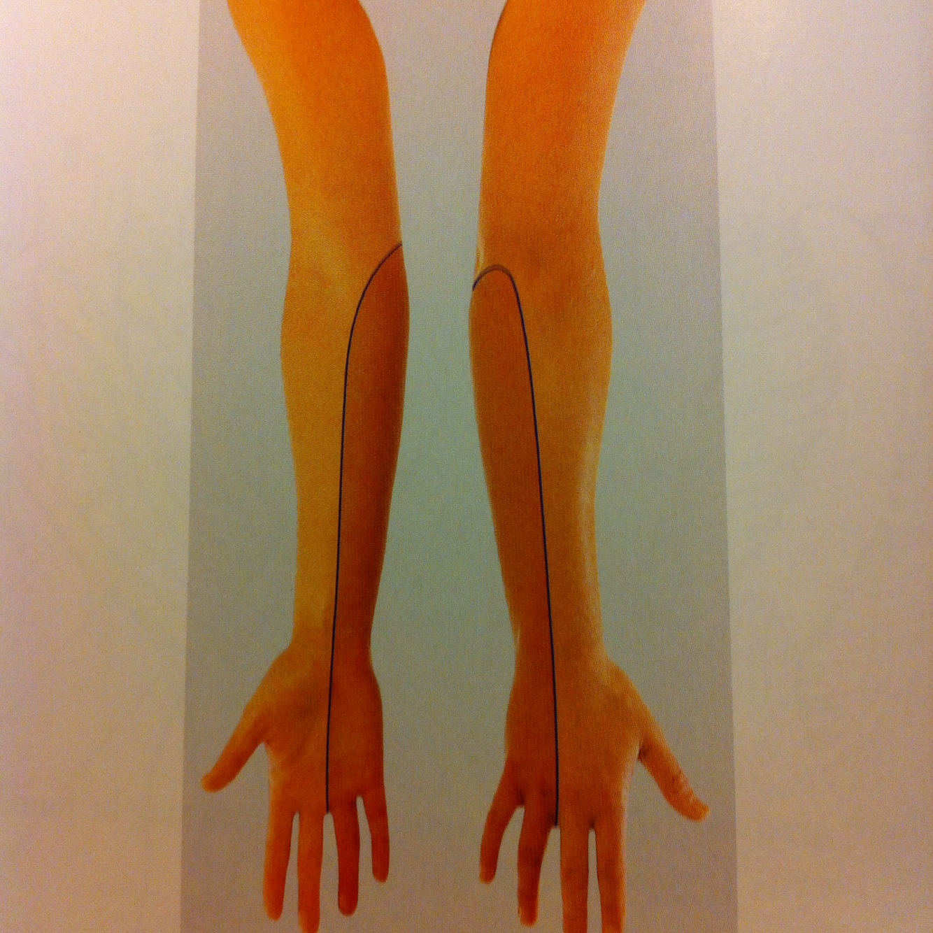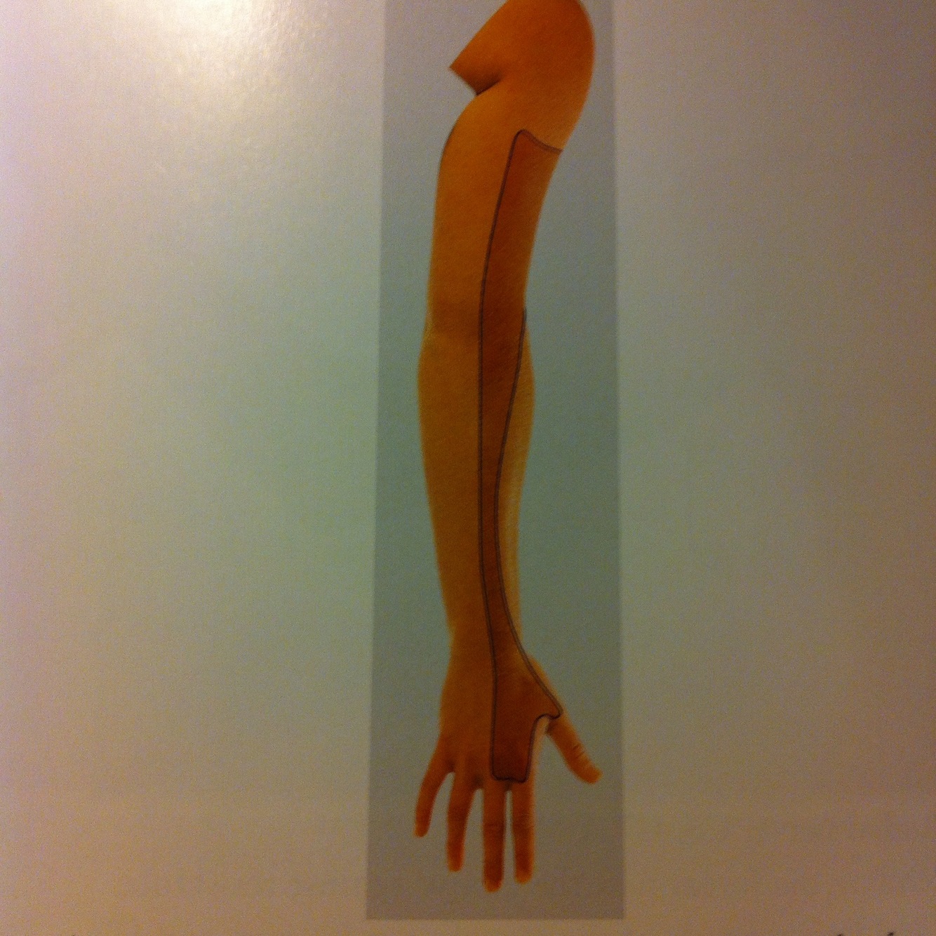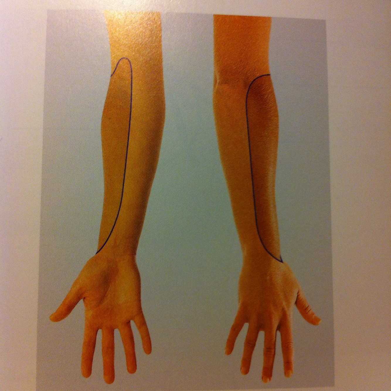 This shows the distribution of the lateral cutaneous nerve of the forearm which is a branch of the musculocutaneous nerve C5, C6