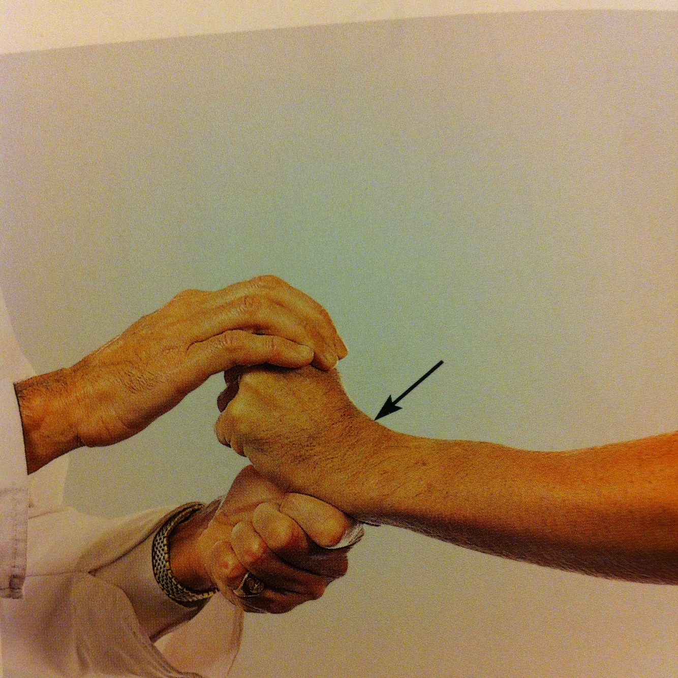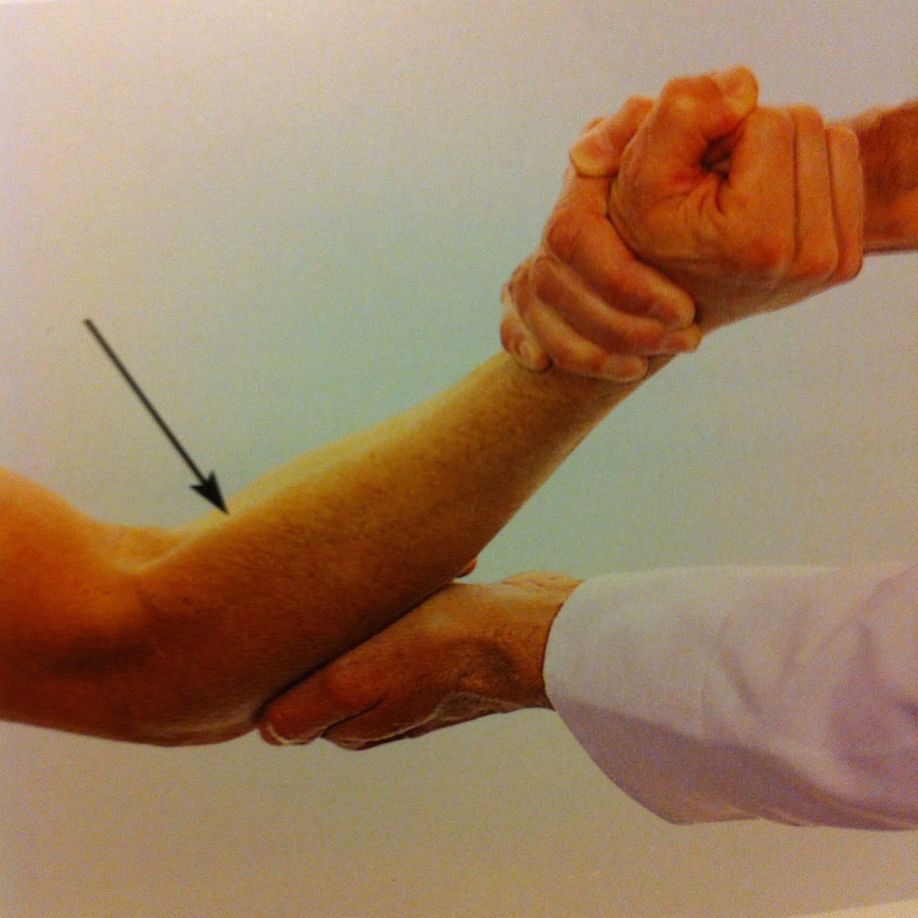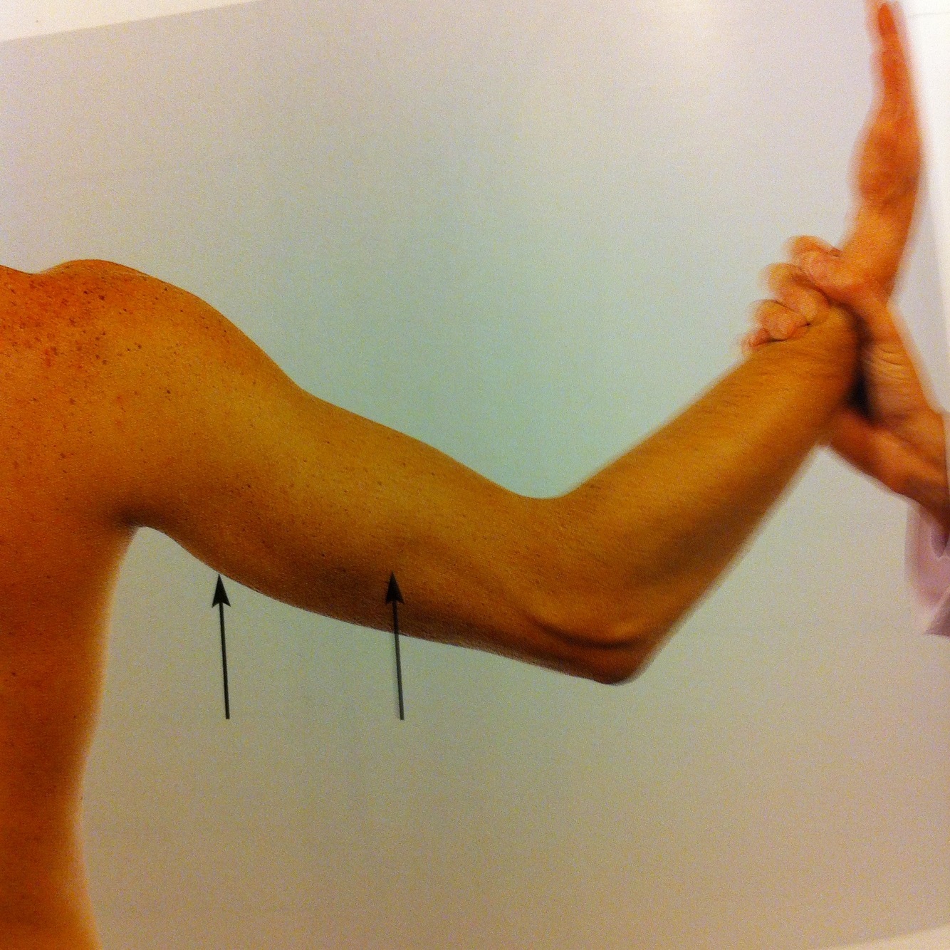 This shows the distribution of the lateral cutaneous nerve of the forearm which is a branch of the musculocutaneous nerve C5, C6