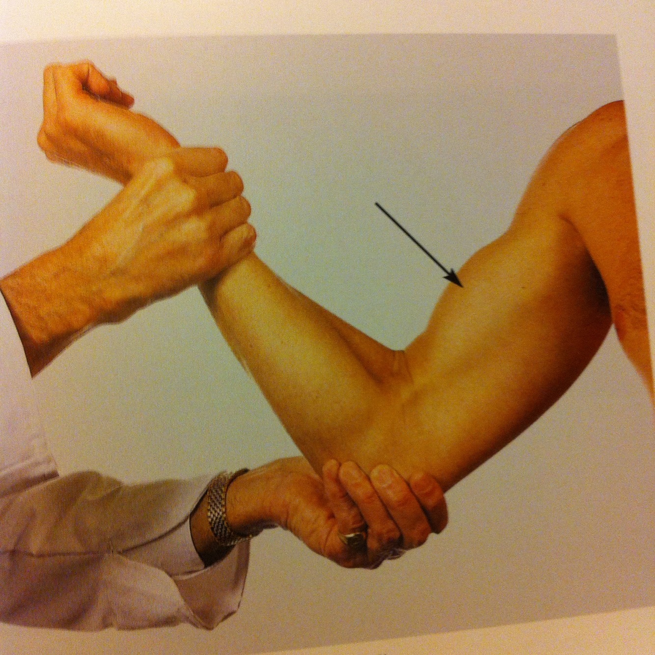 The patient is extending the forearm at the elbow against resistance. The long and lateral heads of the triceps can be seen and felt at the arrows. What is the innervation and roots?